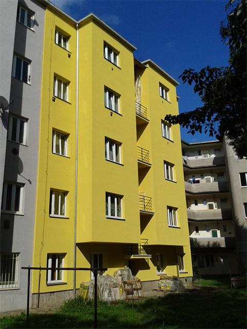 Bytový dům v Praze Strašnicích jsme zateplovali minerální vatou. Dům dostal novou fasádu a s ní i atraktivní vzhled. Zadní stranu jsme omítli jasně žlutou fasádou, která prosvětlila jinak šedý vnitroblok. Na uliční straně jsme museli zachovat vzhled okolních domů, proto jsme zvolili historický odstín omítek Weber Terranova. Červené ostění jsme obložili polystyrenovou formou vytvořenou na laserové řezačce.
